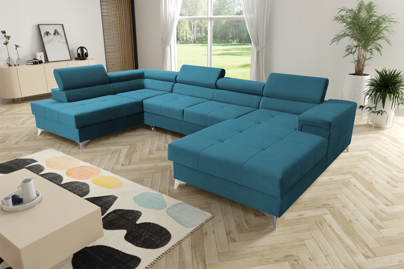 Funkcja spania sprawia, że narożnik staje się nie tylko doskonałym miejscem do odpoczynku, ale także praktycznym rozwiązaniem dla gości, oferując wygodne miejsce do snu o imponujących wymiarach. Automat ułatwiający rozkładanie oraz wbudowany pojemnik na pościel dodatkowo zwiększają funkcjonalność tego wyjątkowego mebla.