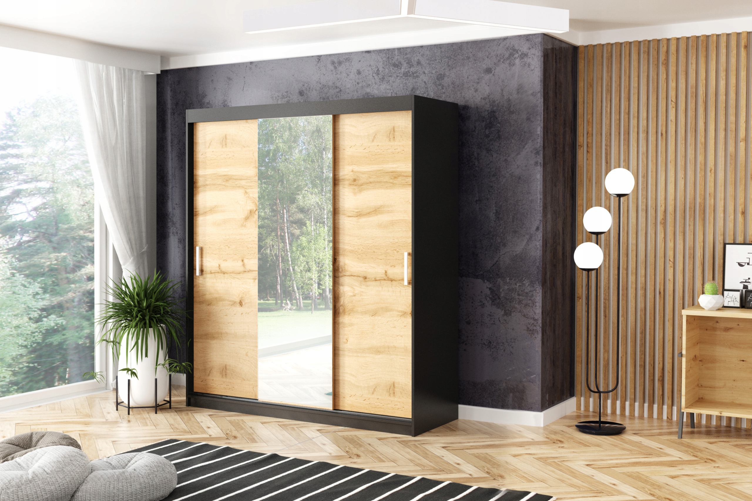 Szafa przesuwna trzydrzwiowa – MOLI Czarny + Dąb Wotan 220 x 205 cm, 16 mm